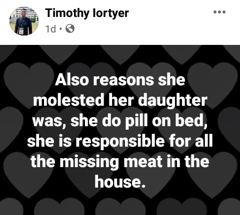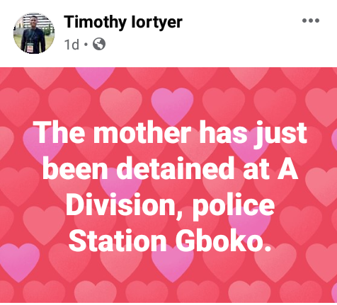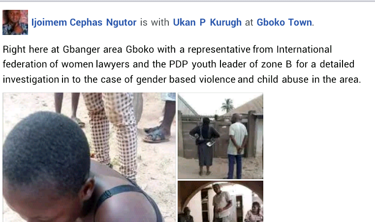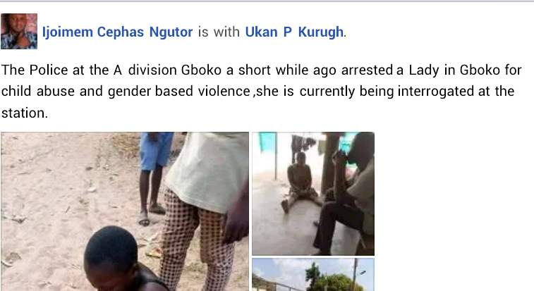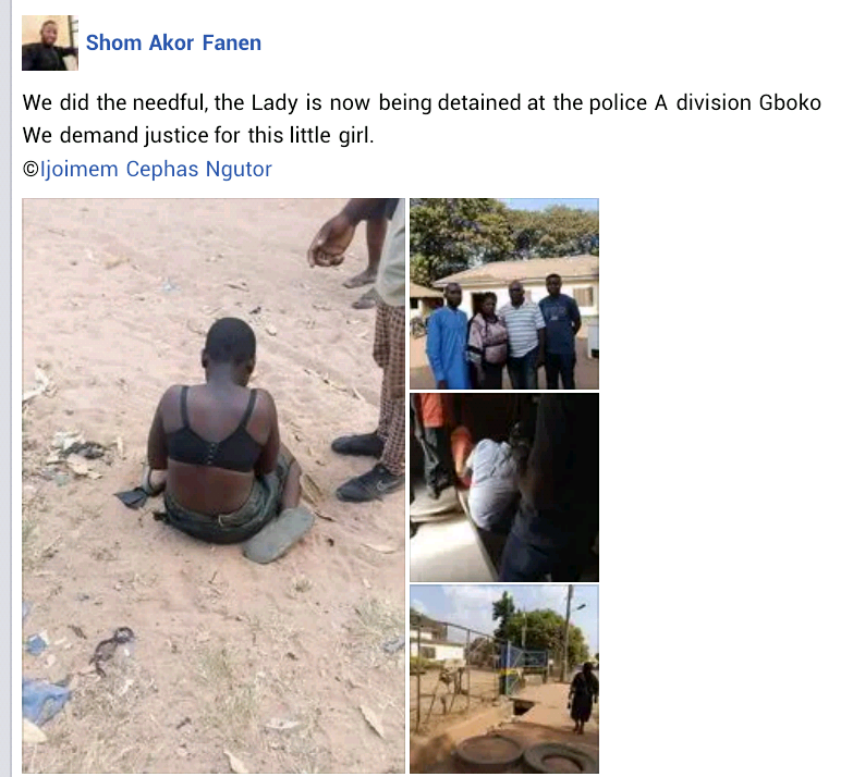 PDP youth leaders and a representative from the International Federation of Women Lawyers ( FIDA) immediately visited the community where they found out that the suspect is actually the girl's biological mother. During interrogation, the woman claimed that she beats her daughter because she ''bed-wets and is also responsible for all the missing meat in the house.'' Further investigation revealed the woman is separated from the child's father. She was subsequently arrested and detained at the A Division Police Staition in Gboko.